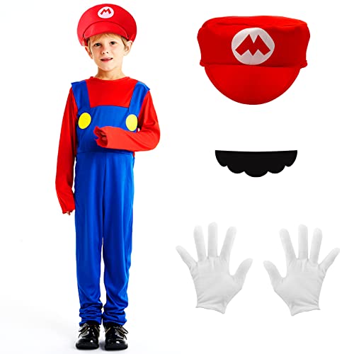 Disfraz de Super Mario Bros Cosplay para Adultos Niños, Mario Luigi Bros Classic Disfraces, Traje de Fontanero con Guantes, Sombrero, Bigote y Broches para Carnaval Halloween Cosplay (Kids-M, Rojo)