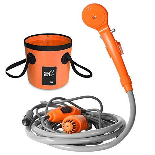 AUTOPkio Kit de Cubo Plegable portátil de la Ducha al Aire Libre,Cabezal de Ducha Que acampa Enchufe en el Adaptador 12V y da Vuelta al Agua en la Corriente apacible Constante (Naranja)