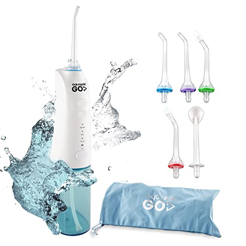 Aquapik Go Irrigador Bucal Portátil de viaje Profesional Recargable - Irrigador Dental 5 Boquillas 3 Modos, IPX7 Impermeable, Limpieza Dental, Irrigadores bucales Eléctrico, con rotación 360º