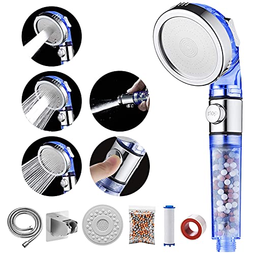 MIAOHUI Ducha Azul con Filtro de Iones y Filtro de Cal, Ducha de 3 Modos con Filtro Equipada con Manguera, Soporte, Algodón PP, Paquete de Bolas de Filtro, Panel