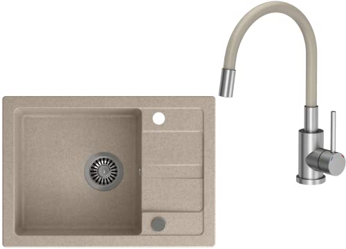 VBChome Fregadero con grifo, color beige, 62 x 44 cm, de granito, superficie de goteo moteada, reversible, grifo de cocina, color beige + sifón + dispensador de detergente