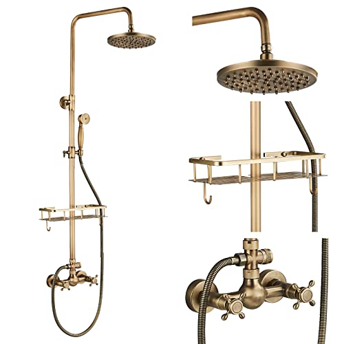 Rozin Grifo de ducha de latón antiguo con alcachofa de ducha de 8 pulgadas, cabezal de ducha de lluvia con estante de almacenamiento