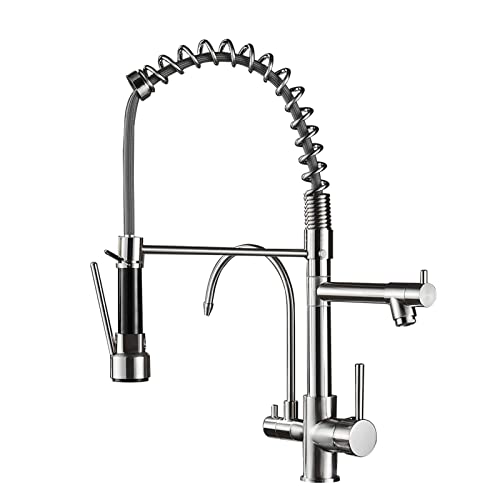 Grifos Cocina Fregadero Osmosis 3 Vias con Dos Caños Grifo Fregadero Extraible Arco Alto Grifo de Cocina Fregadero Muelle en Espiral 3 en 1 para Purificador de Filtro de Aguay Cepillado