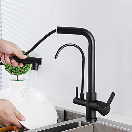 Grifo 3 Vias Osmosis Grifos Cocina Fregadero Extraible Muelle en Espiral Grifo Mezclador Cocina con Dos Caños Griferia de Cocina Grifo para Fregadero Negro,B