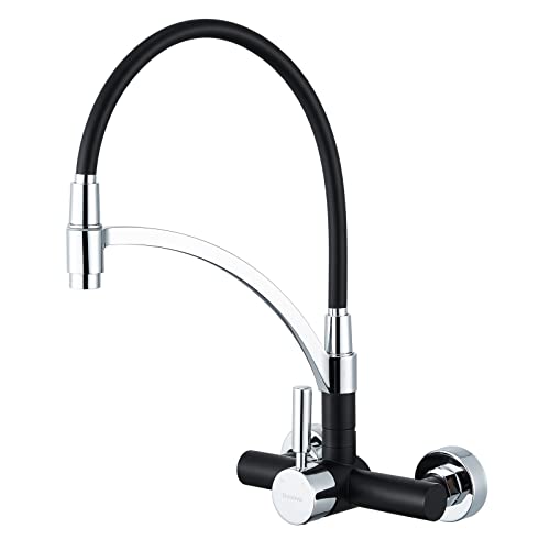 HOMELODY Grifo de cocina de montaje en pared, color negro, giratorio 180°, silicona de calidad alimentaria, grifo de pared flexible extensible para fregadero de cocina de latón (altura total 342 mm)