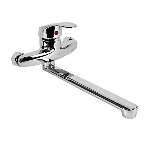 Kibath Grifo monomando de cocina fregadero BAT de pared con caño largo giratorio, Fabricado en latón con acabados en cromo brillo, Distancia entre las tomas de 11 cm, Repuestos garantizados