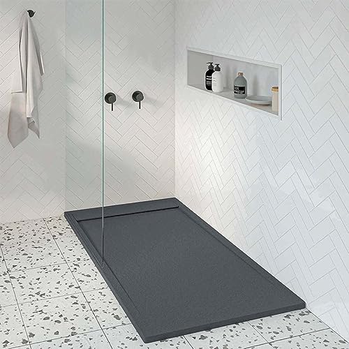 Wakects Plato de Ducha Resina, Platos Duchas de Baños Textura Pizarra Antideslizante Material SMC con Resina + Fibra de Vidrio + Polvo de Piedra Negro, 100 x 70 x 2,6 cm