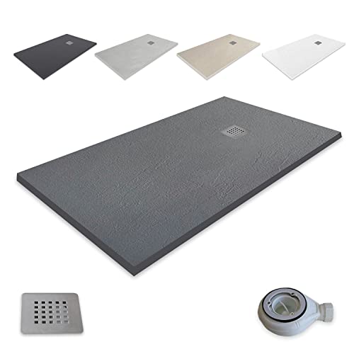 Shower Online Plato de ducha Resina PLES - 80x90 - Textura Pizarra - Antideslizante - Todas las medidas disponibles - Incluye Rejilla Inox y Sifón - Gris RAL 7035