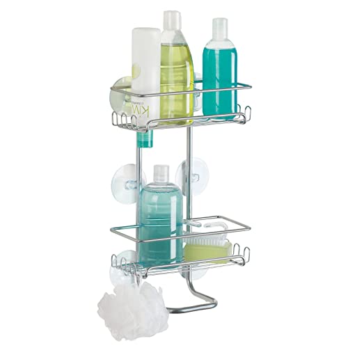 mDesign Estantería de ducha para colgar – Fácil instalación sin agujeros de este colgador para ducha – Cestas metálicas con 2 repisas y ganchos para los accesorios de ducha – plateado