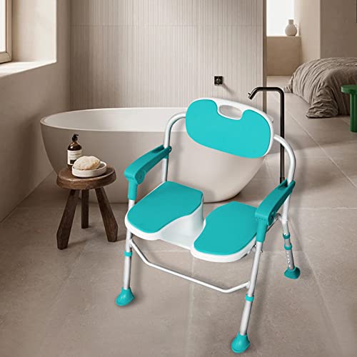 Treesunshine Silla de ducha plegable, con reposabrazos, altura ajustable, taburete de ducha para personas mayores con respaldo y reposabrazos, montaje sin herramientas, hasta 350 litros, color azul