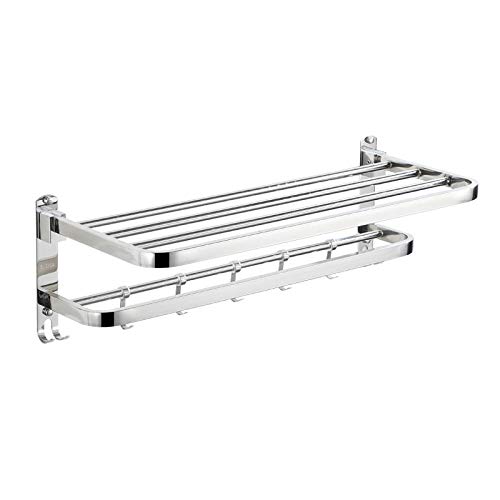 XIAJIA-Doble Barra de Toalla,Estante de almacenamiento plegable montado en la pared con 5 ganchos,58cm x 24cm x 19.5cm,SUS 304 Acero inoxidable ,90 grados de rotación,Impermeable Completo (Plata)